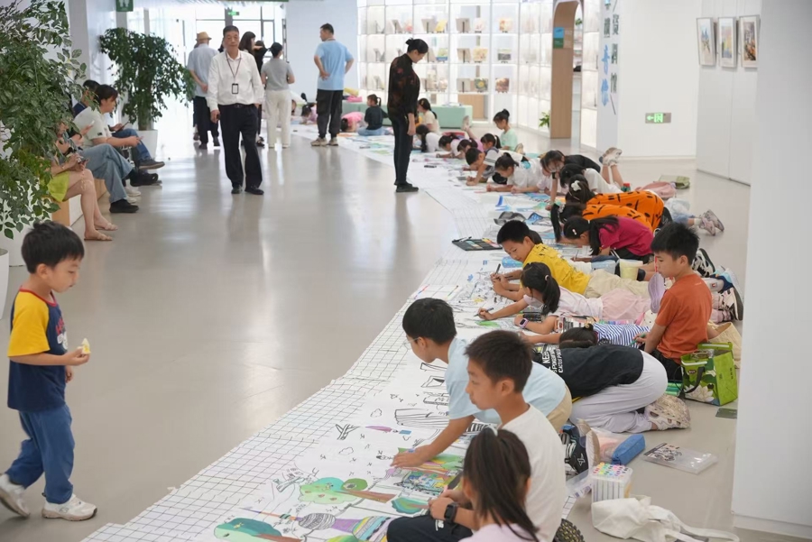 展览现场,由浦东新区青少年活动中心组织50位小画家集体创作“童眼看浦东童心画美好”书画百米长卷,将活动气氛推向高潮。
