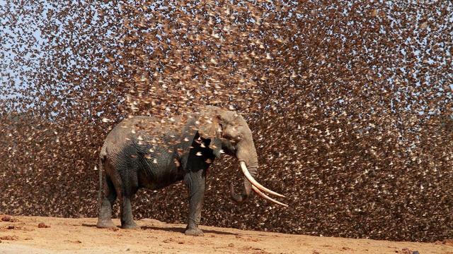 有人曾在一个水坑附近拍到一群密密麻麻的小鸟攻击三头大象,大象不堪其扰,最终只能逃离现场。这种小鸟就是红嘴奎利亚雀,体型10cm左右,但数量庞大,这次攻击大象的,预估有20多万只,那画面,就像是戴着鸟翅膀的蝗虫,要不是大象皮糙肉厚,分分钟就能被蚕食干净。