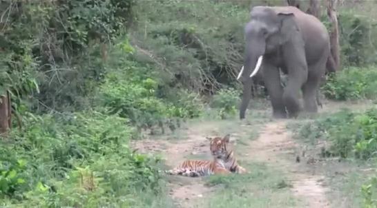 2021年网络流行一个视频,视频中,一头大象随意漫步,在它前面卧着一只老虎,挡住了大象的去路。大象并没有在意,仍向前行走,老虎转身发现大象后,很识趣地站起来跑进了灌木丛,给大象让了路。
