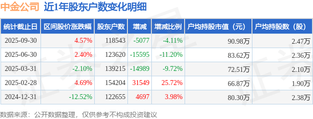 从股价来看,2025年6月30日至2025年9月30日,中金公司区间涨幅为4.57%,在此期间股东户数减少5077.0户,减幅为4.11%。